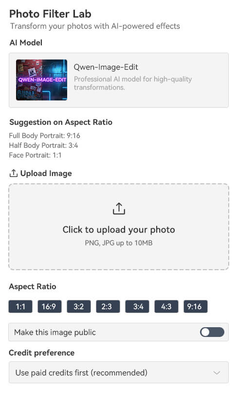 The tool supports PNG and JPG image formats. You can upload photos up to 10MB. This makes it easy to use most of your pictures without resizing them.